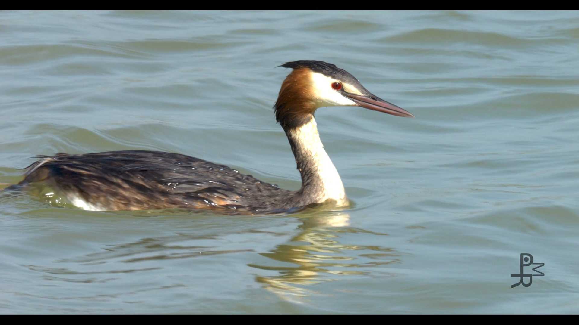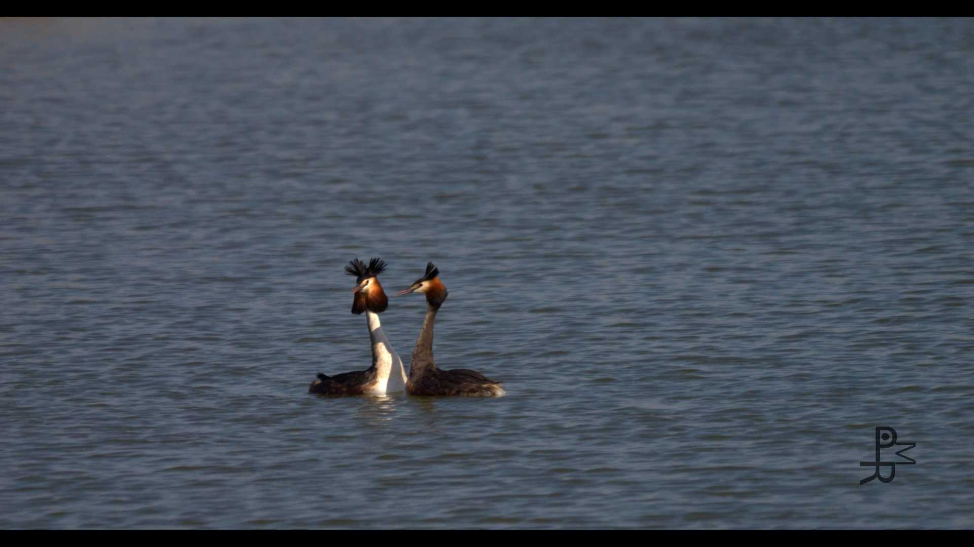 La parada nupcial completa del Somormujo lavanco, Podiceps cristatus, es muy sofisticada e incluye una danza de apareamiento de la que vemos el preludio.