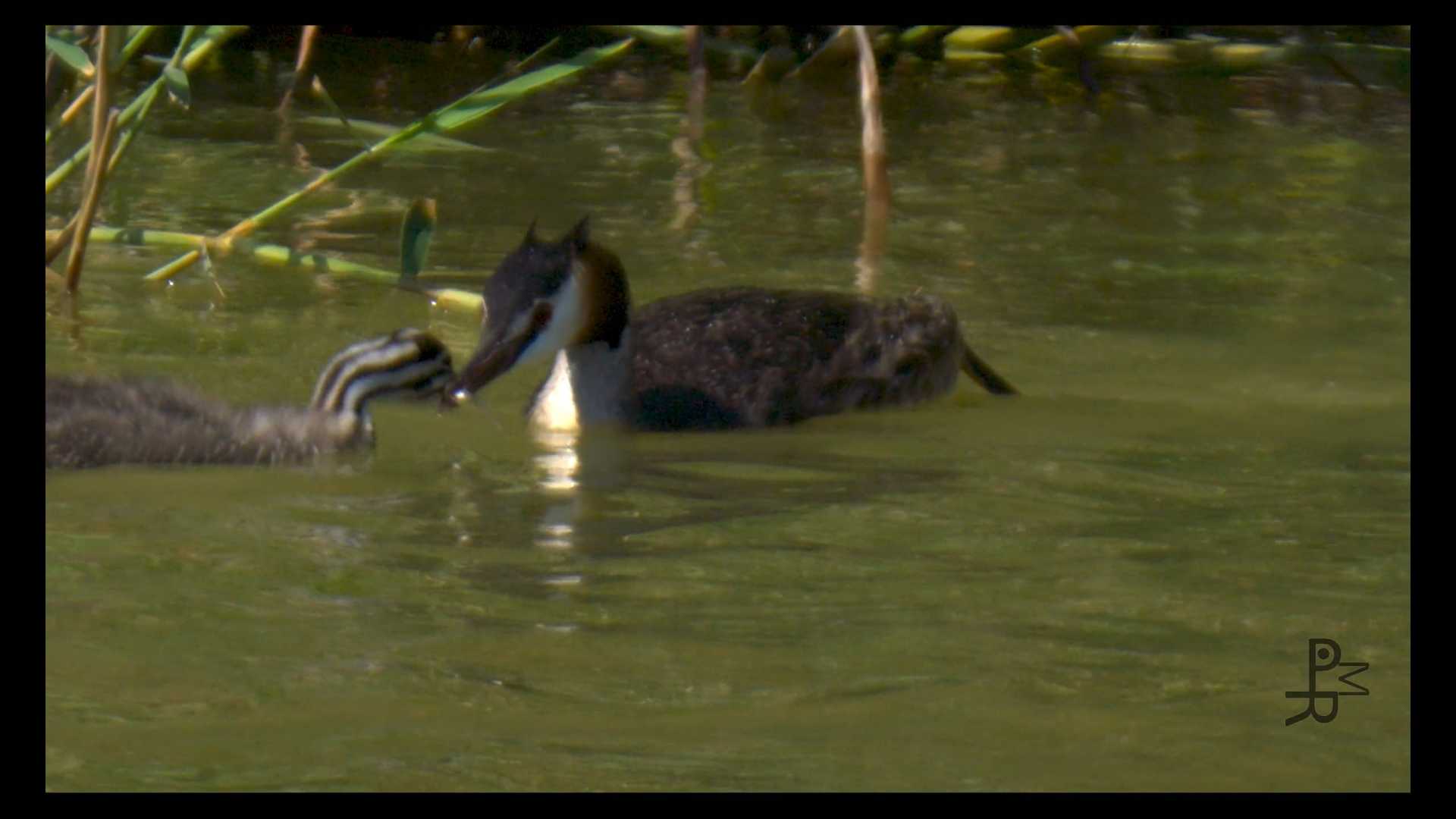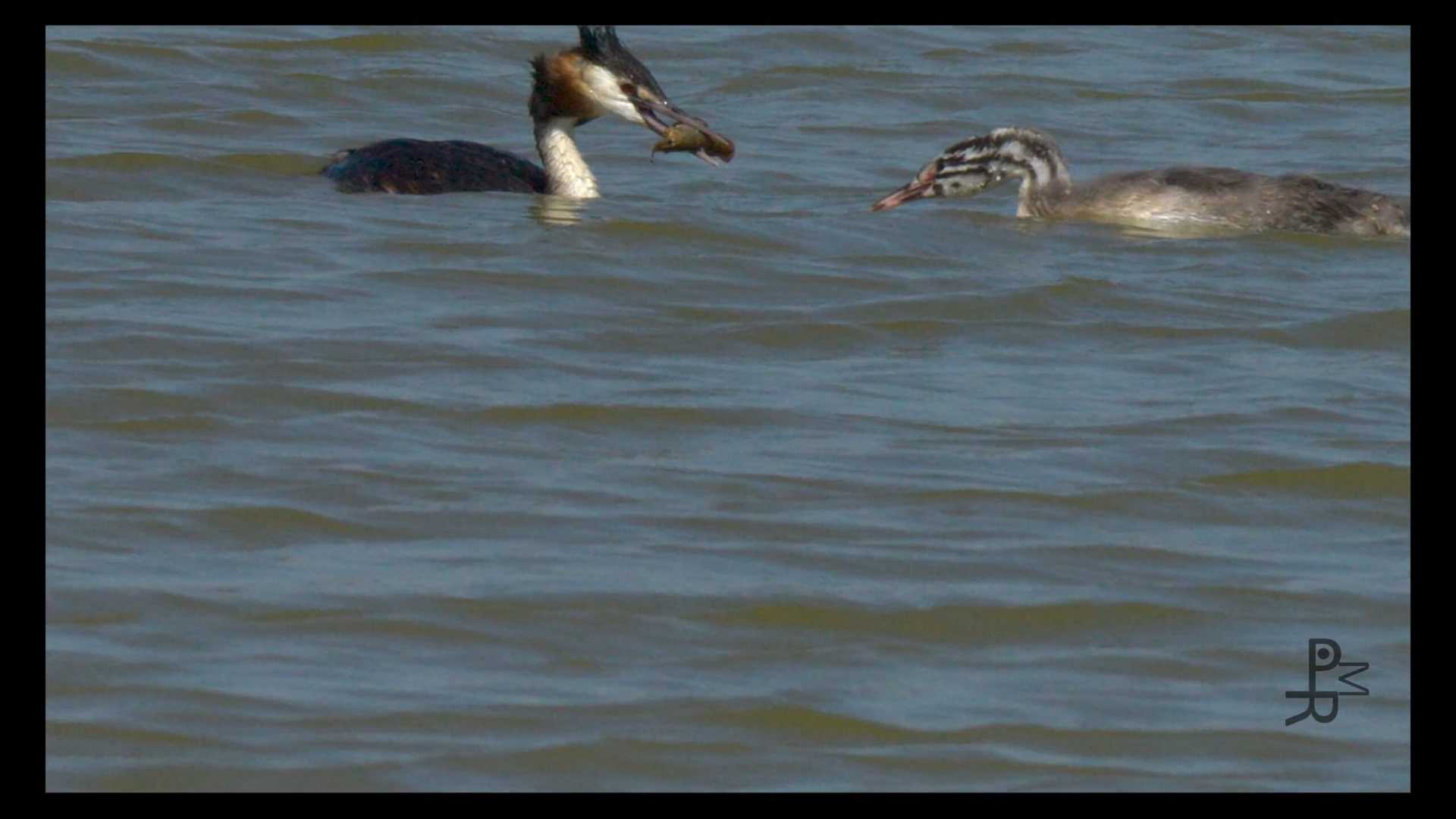 El Somormujo lavanco, Podiceps cristatus es un excelente buceador. Una hembra consigue un pececillo y luego un cangrejo de río. Los pollos raramente pueden engullirlos. Bajo las atenciones de su madre al final opta por tragárselo ella.