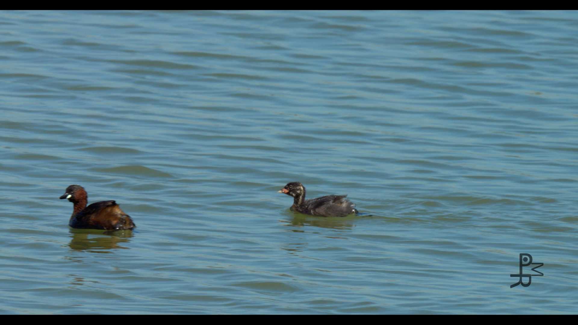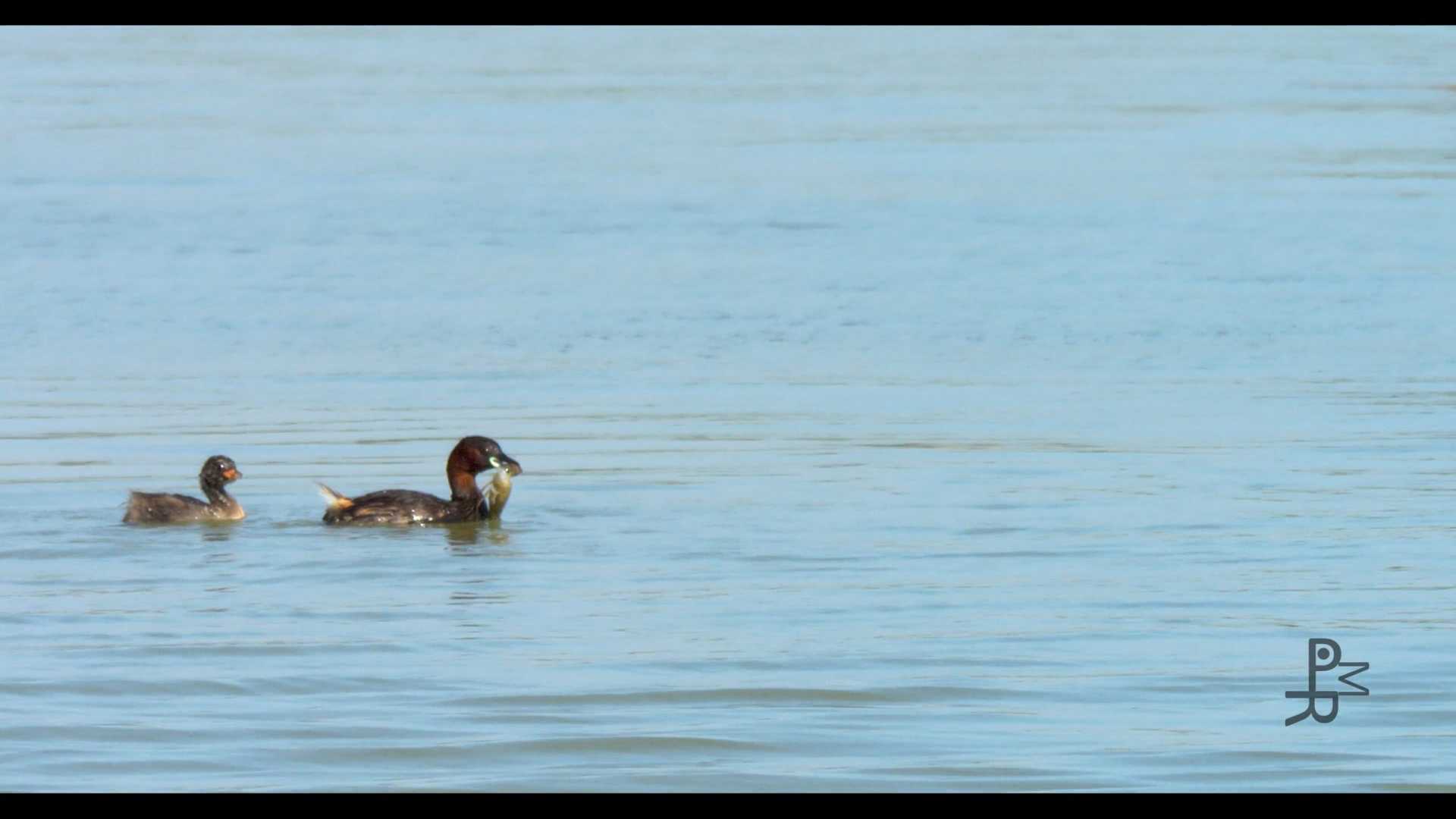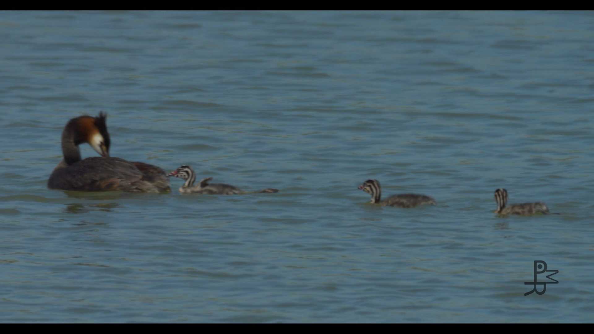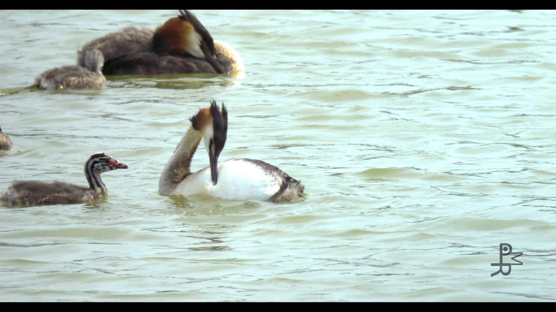 Una hembra de Somormujo lavanco transporta su pollada sobre su espalda. Se libera de ellos y nadan junto a ella. Uno se retrasa y al rato aparece siguiendo al macho..