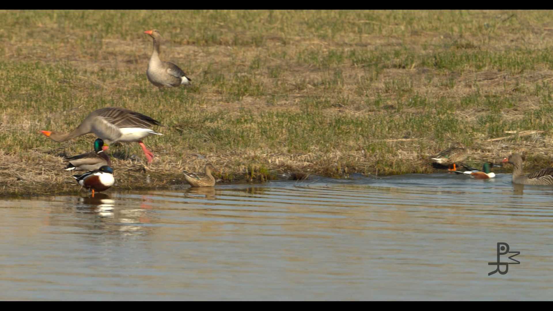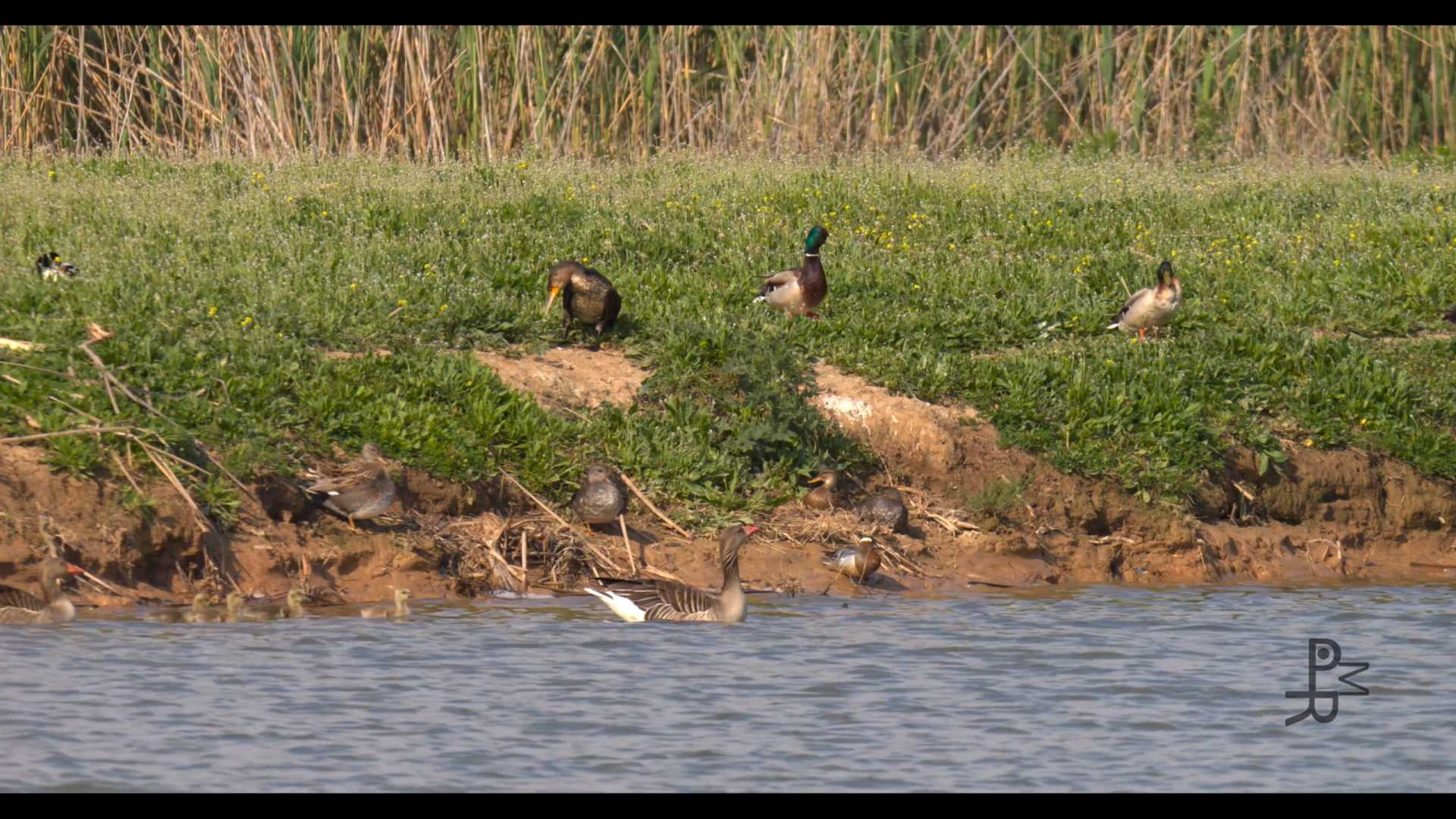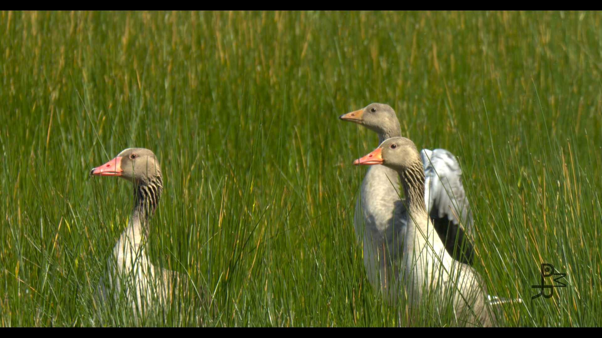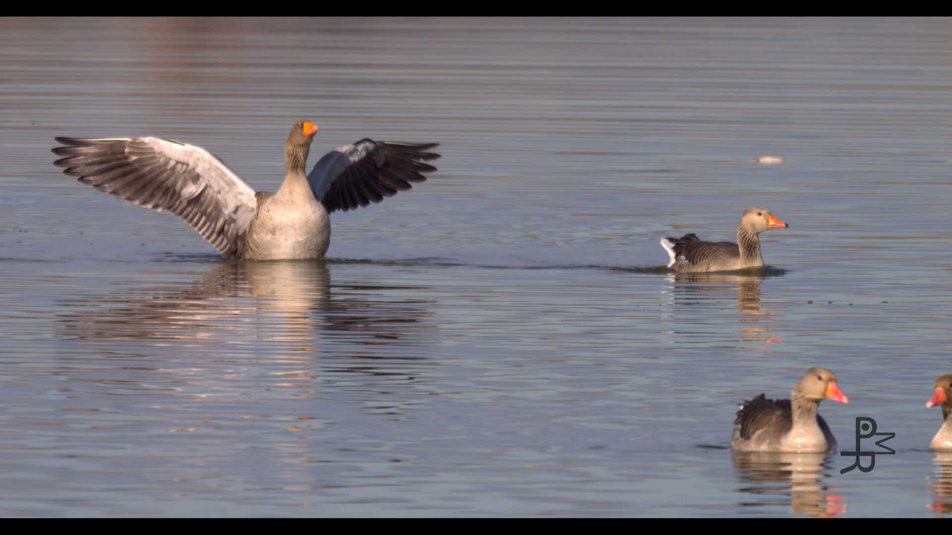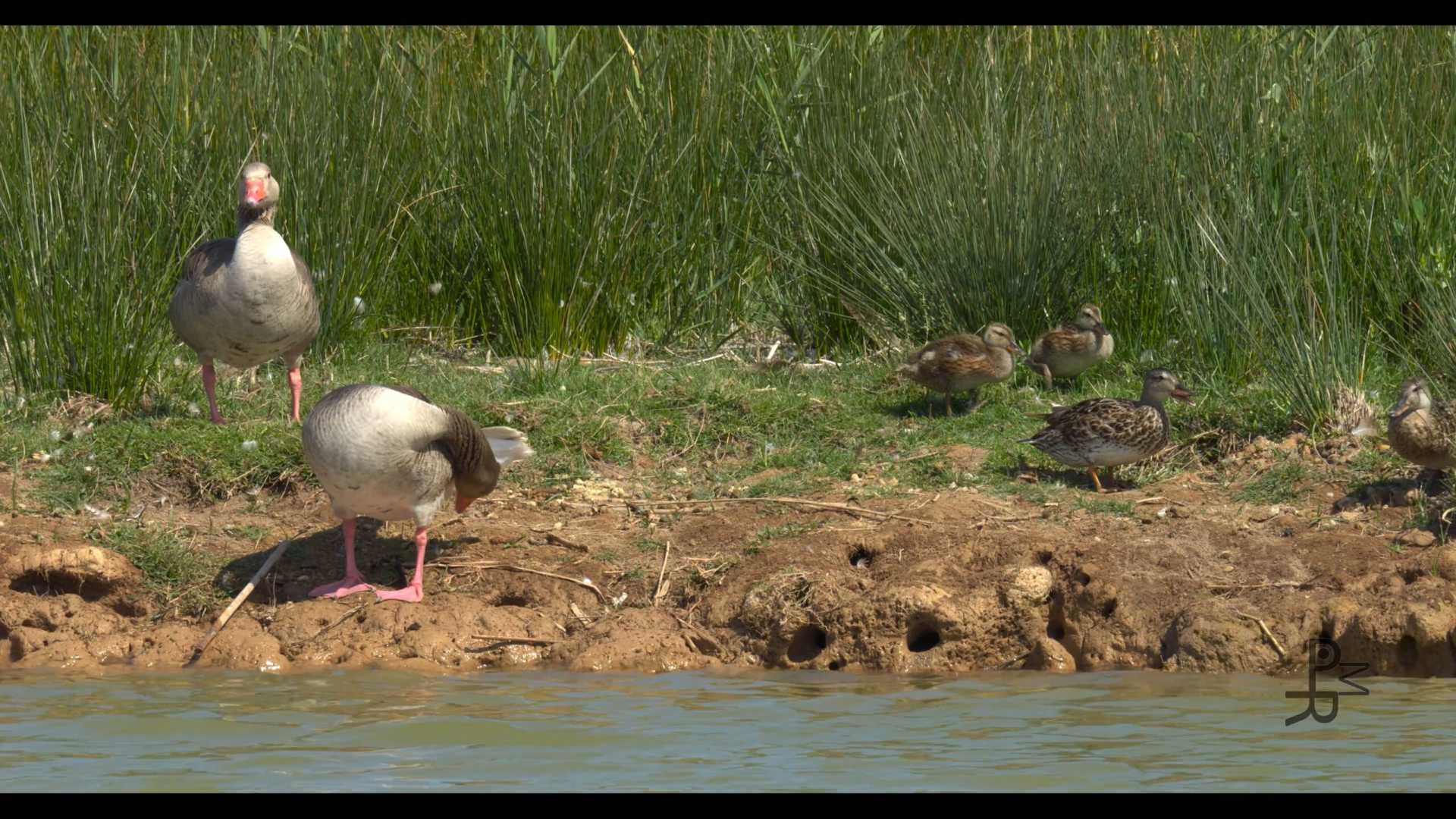 El Ansar común observa el paso de una pata con sus crías. Otra pata se siente desplazada. Una cuestión de jerarquías y tal vez respeto.