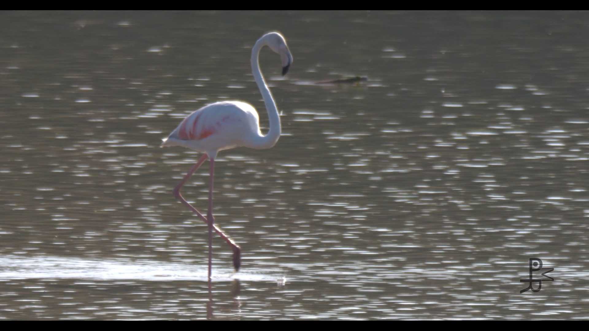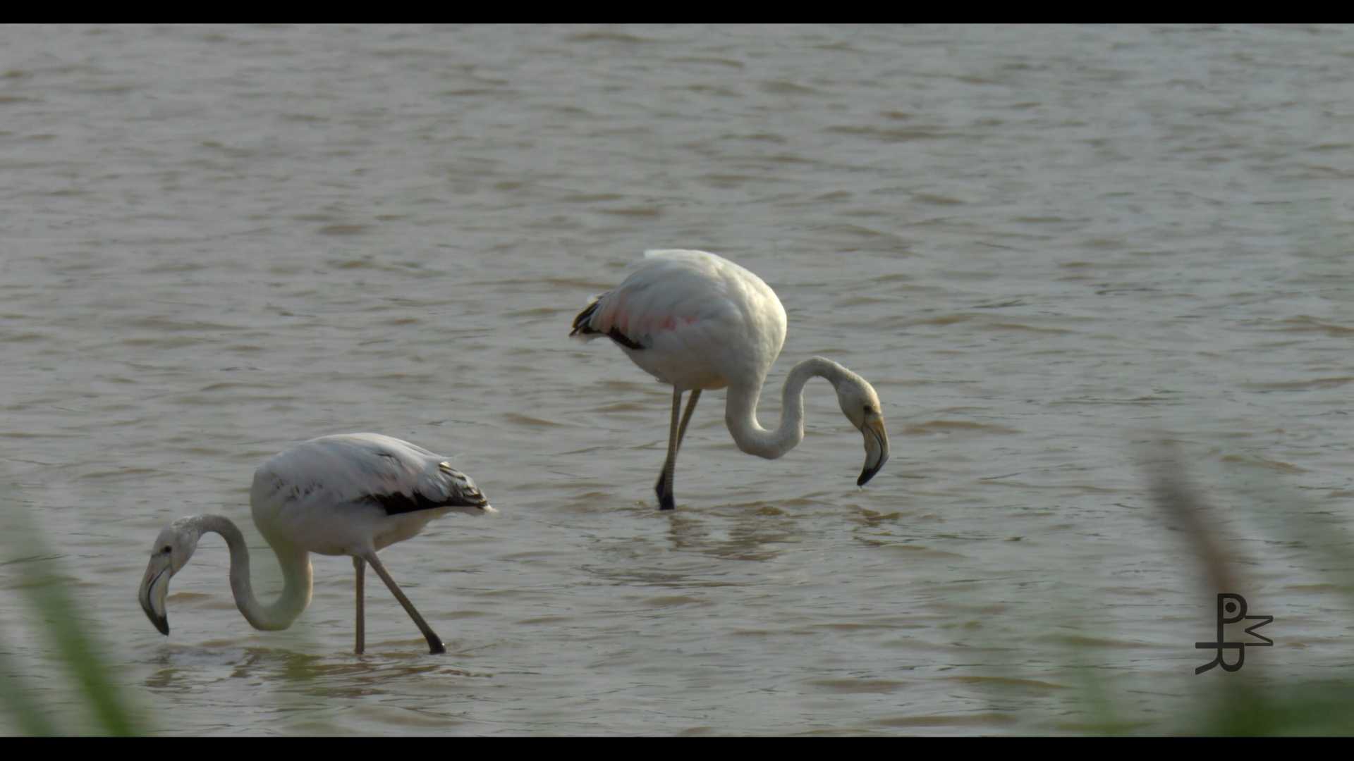 El flamenco común, Phoenicopterus roseus, con hasta 145 cm de alto y una envergadura alar de 170 cm, remueve el fondo para que pequeñas algas, diatomeas, cianobacterias, huevos de invertebrados, crustáceos como la artemia salina en suspensión, entren en su pico, siendo filtrados gracias a las laminillas presentes a lo largo del borde del pico. mientras se expulsa el agua con la lengua.