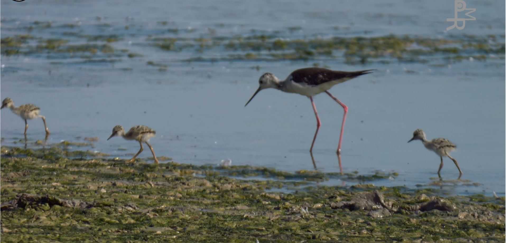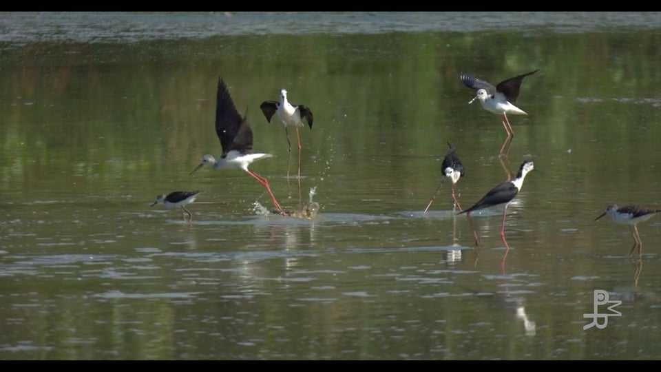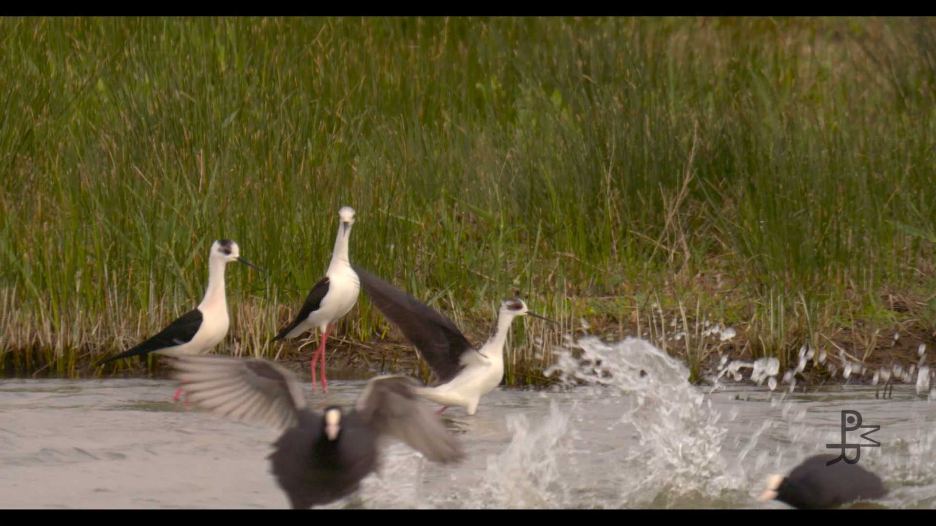 La cigüeñuela , Himantopus himantopus es un ave territorial. Los adultos de un grupo familiar con pollos ataca a los adultos y pollos de otra con fuertes golpes de sus largas patas. La zona inundada estaba en claro retroceso, una semana despúes era barro.