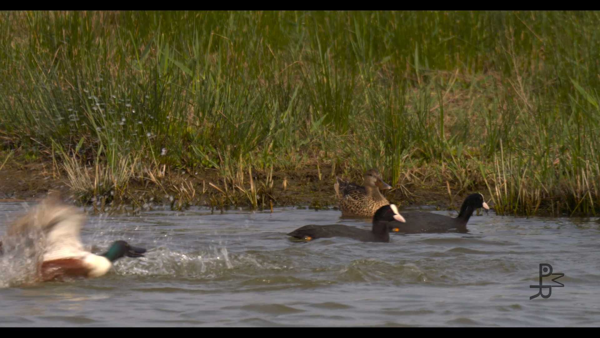 El pato cuchara se reconoce por su vistoso colorido en época de celo y por su pico aplanado diseñado para la filtración en aguas someras de todo tipo de materia vegetal y pequeños animalillos. En este caso dos machos se enzarzan en una enérgica riña.
