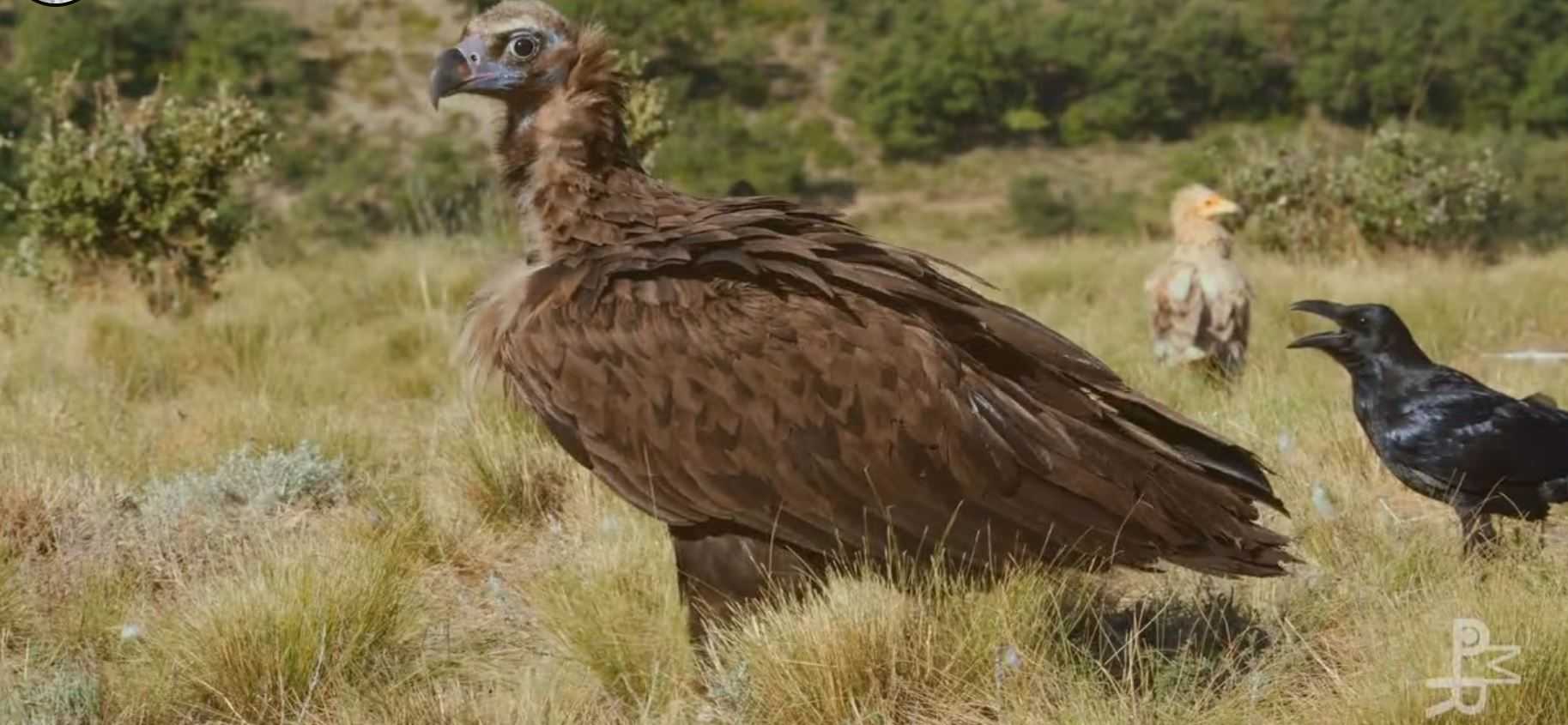 La hembra de Aegypius monachus parece agobiada por las intenciones de su consorte. Monachus hace referencia a la capucha y hábito de un monje . El pavoneo esteriotipado del macho parece decir: "estoy aquí"