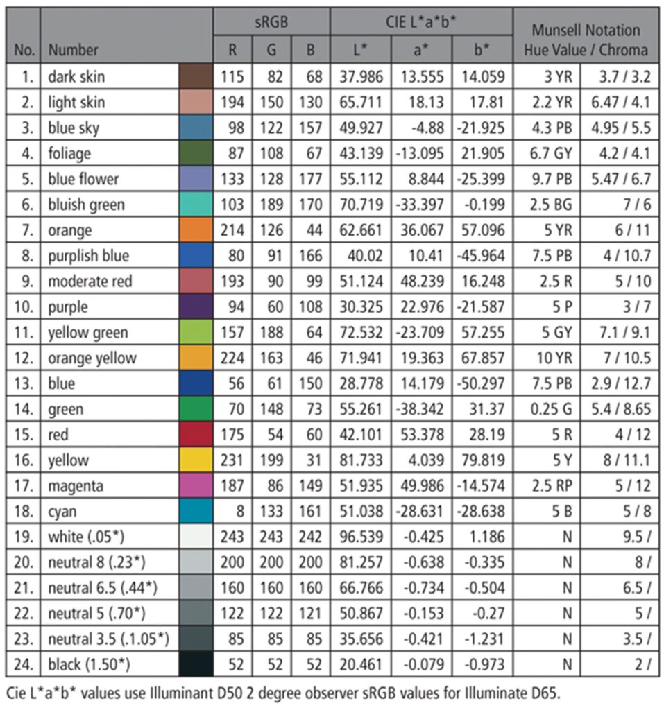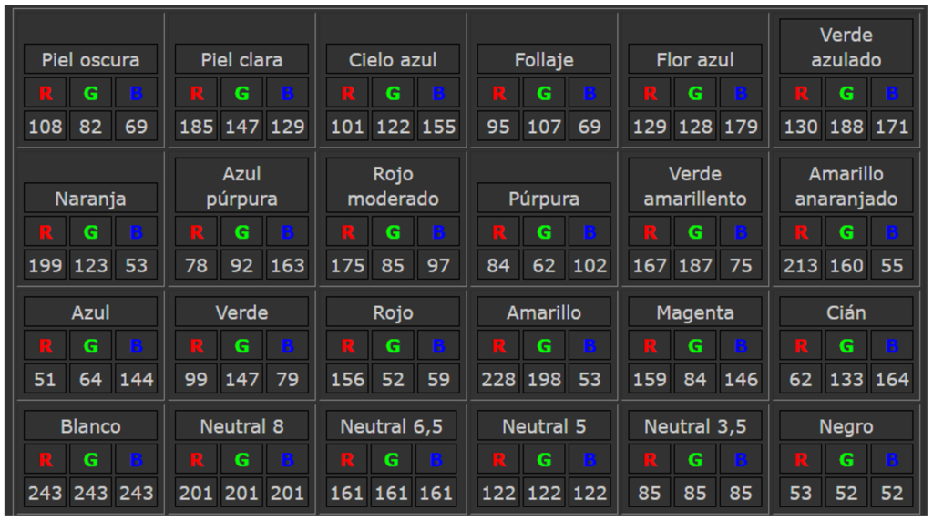 Carta Colorchecker Clásica  de X-rite (18 parches de color y 6 parches neutros)