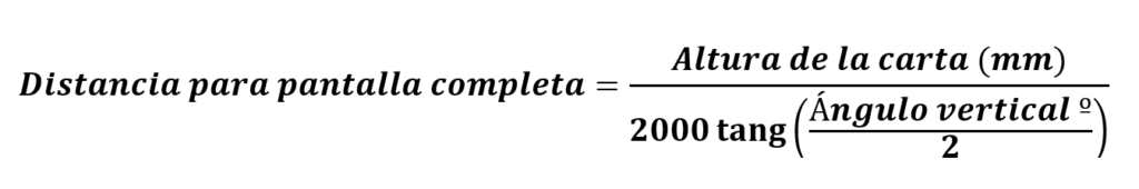 Focal (mm) | Ángulo vertical º | Distancia para pantalla completa |